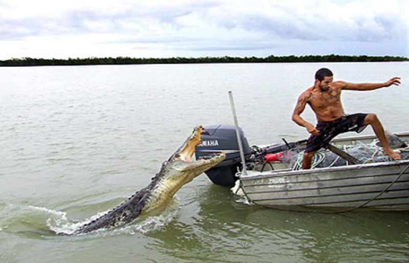 Kiekvienas savo hobiui atsidavęs žvejys žino, kad tai, ką galima ištraukti iš įvairių vandens telkinių, kartais gali net labai nustebinti ar išgąsdinti. Taip nutiko ir šiam žvejui: manydamas, kad tai tik labai stambus šamas, vyras čiupo plūdurą ir pradėjo jį smarkiai traukti, tačiau tai, kas išniro iš vandens, privertė vyrą kuo greičiau dėti į kojas. Lance Burgosas, į žvejybą išvykęs su dukra, to tikrai nesitikėjo. Ant užmesto masalo užkibo ne kas kitas, o milžiniškas krokodilas. Tai juos taip išgąsdino, kad vyras, metęs plūdurą atgal į vandenį, kaip įmanydamas puolė minti valtyje įtaisytus pedalus, mėgindamas pasprukti nuo po vandeniu grėsmingai tūnančio milžino. (4 pav.)