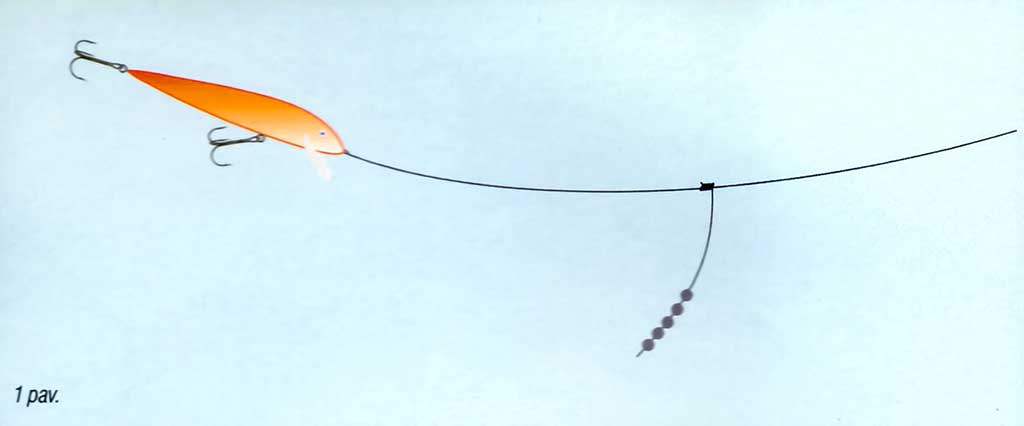 1 pavyzdyje matote patį paprasčiausią variantą, kurį pasidaryti neužtruksite nė minutės, jis labiau skirtas ešeriams bei sterkams. Nors šitokia sistemėlė labai elementari, tačiau tikrai nėra prasta. Bene didžiausias jos privalumas – originalus svarelis. Tiksliau – svareliai, kadangi ant apatinės valo atkarpos nedideliais atstumais užspaudžiami plūdinėje žūklėje naudojami šrateliai. Išeina savotiška grandinėlė, kuri dėl savo formos dažnai išvengia kliuvinių. Akmenynuose toks svarelis beveik nepakeičiamas.