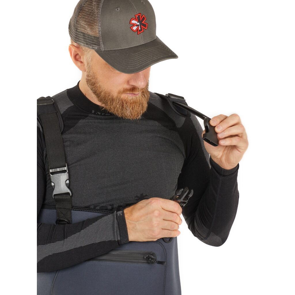 - Išorinė krūtinės kišenė su vandeniui atspariu užtrauktuku