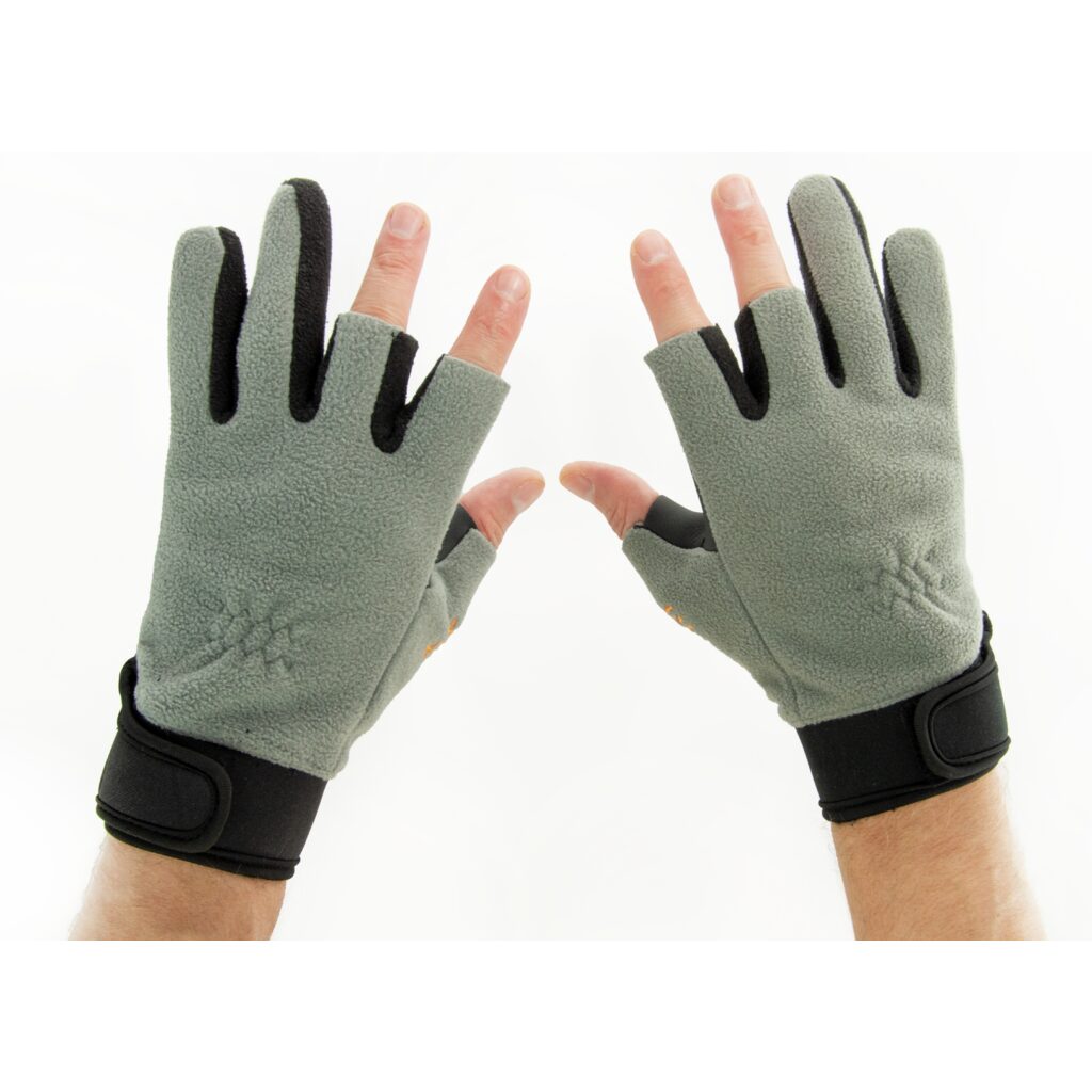 Pirštinių nykštys, vidurinis ir rodomasis pirštai yra atviri, kad būtų galima tiesiogiai liestis su žvejybos reikmenimis.