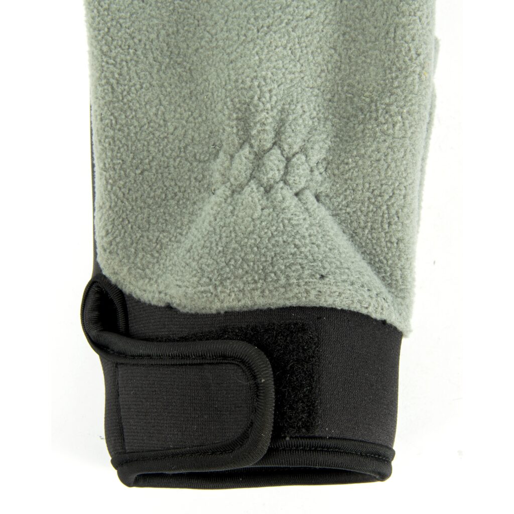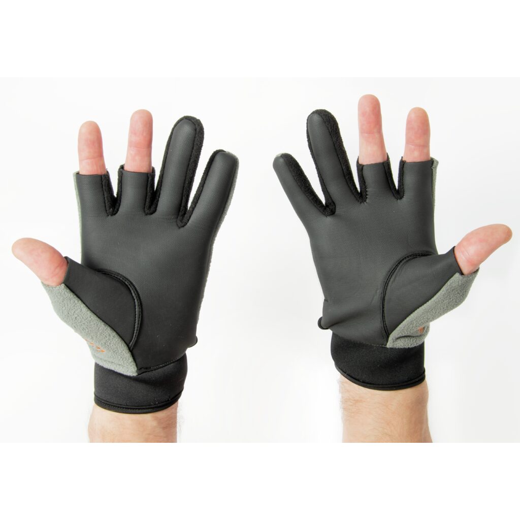 Pirštinių nykštys, vidurinis ir rodomasis pirštai yra atviri, kad būtų galima tiesiogiai liestis su žvejybos reikmenimis.