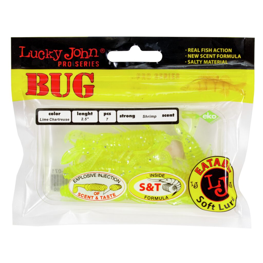 Lucky John Bug serija specialiai sukurta ešerių žūklei. Tobulai sukurtas guminuko dizainas kuris vandenyje itin aktyviai dirba ir išveda iš proto bet kokį plėšrūną. Lucky John plastiko kokybė aukščiausia - druskom ir krevetės kvapu prisodrinta guma. Rekomenduojama naudoti su Texas, Wacky , Drop Shot sistemėle ar standartiniu galvakabliu.
