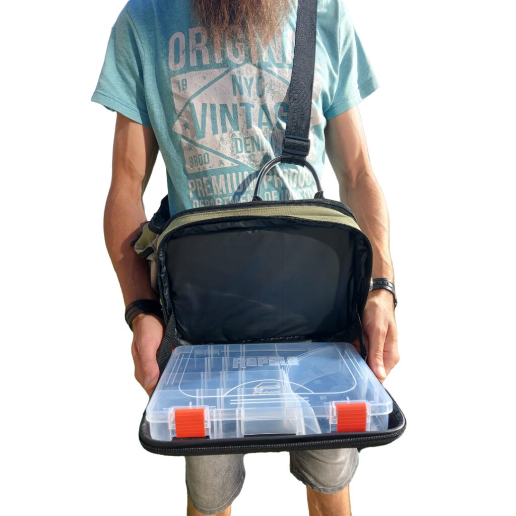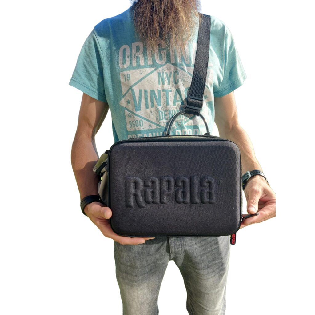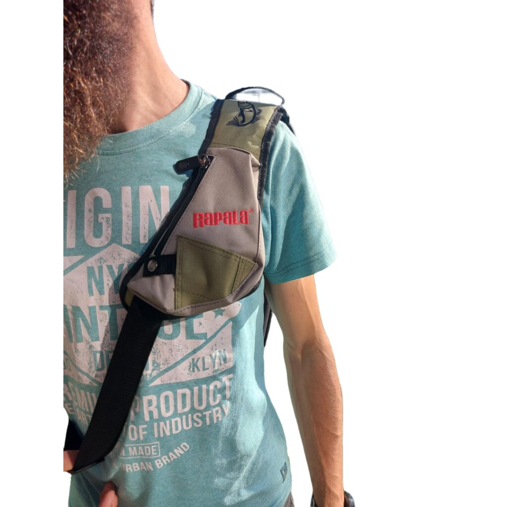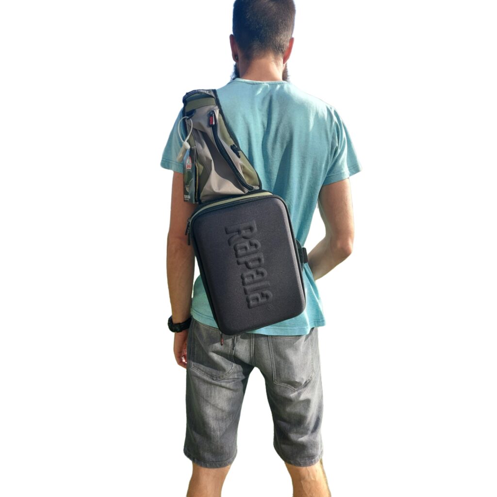 Rapala krepšys per petį - Sling Bag. Populiarus mobilaus spiningautojo krepšio modelis. Tiesiog permeskite per petį ir pirmyn! Su savimi visuomet turėsite dvi talpias Plano 3600 modelio dėžutes, atskirus skyrius papildomiems aksesuarams, telefonui. Sumontuotas ištraukiamas laikiklis žirklutėms, patogus D formos žiedelis kitiems pakabinamiems įrankiams, reguliuojamas diržo ilgis, tad krepšys tiks nešioti net ir apsirengus daug rūbų sluoksnių. Atvertus skyrių, galite naudoti jį kaip darbinį stalčiuką persegant masalus, kalbiukus ar perrišant valą. Jei spiningaujate vaikščiojant krantu - tai iš tiesų yra jums sukurtas krepšys.