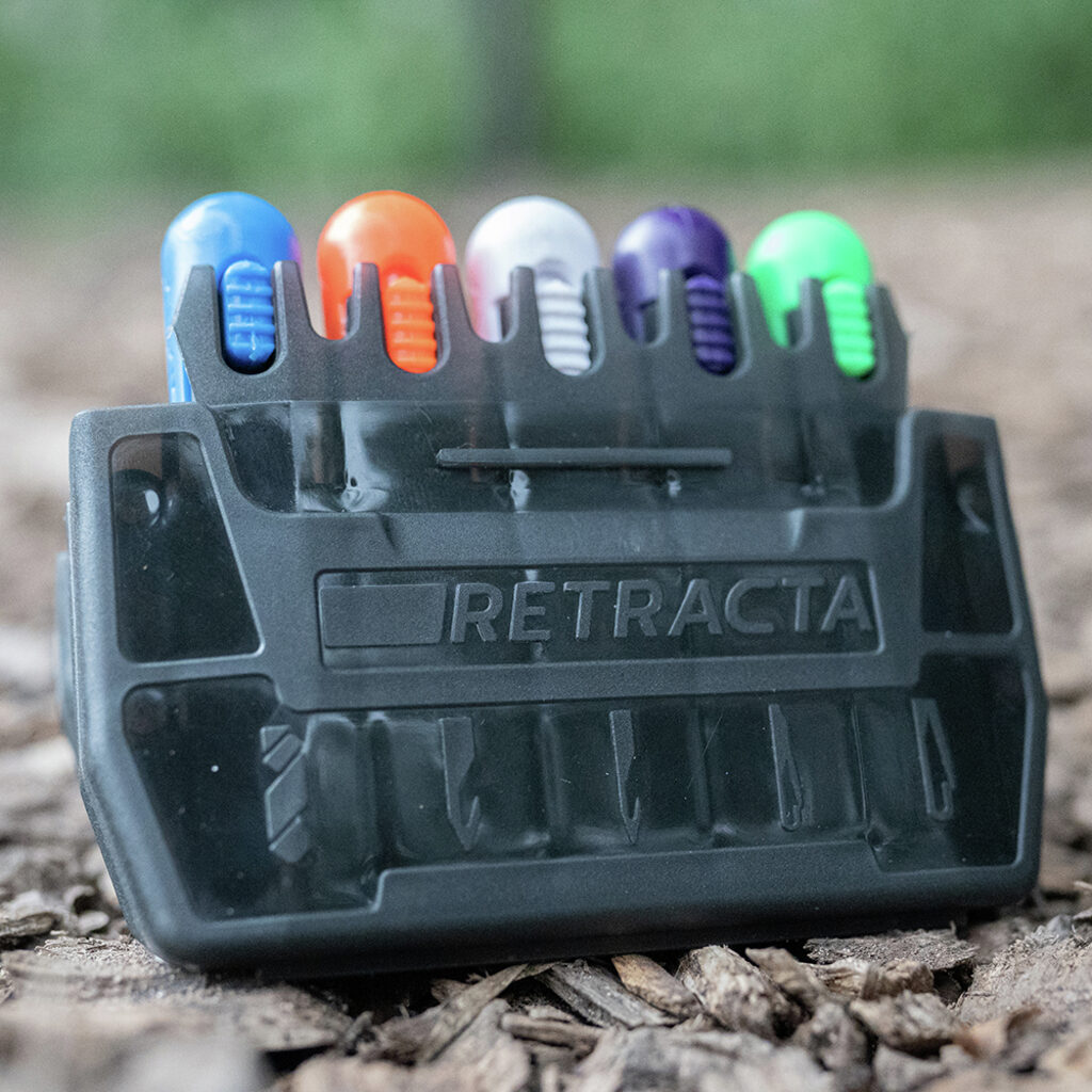 "Retracta" įrankių rinkinyje yra visi 5 "Retracta" masalų įrankiai, sudėti į itin kompaktišką kietą dėklą.