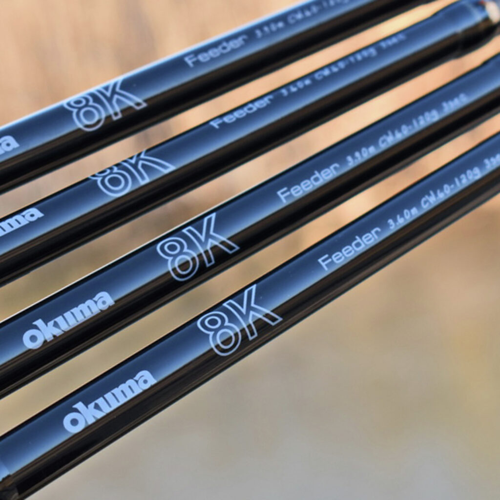 Okuma 8K Feeder meškerė pasižymi itin lengva 40T anglies blanko konstrukcija, greitesne akcija su 2 stiklinėmis ir 1 angline, skirtingo galingumo viršūnėlėmis, "Fuji DPS" ritės laikiklis ir AAA kokybės kamštinė rankena.