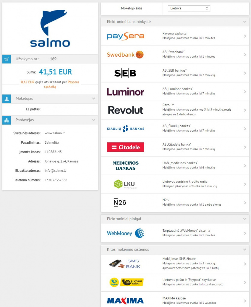 Pirkėjas SALMO internetinėje parduotuvėje gali pasirinkti vieną iš šių atsiskaitymo būdų: