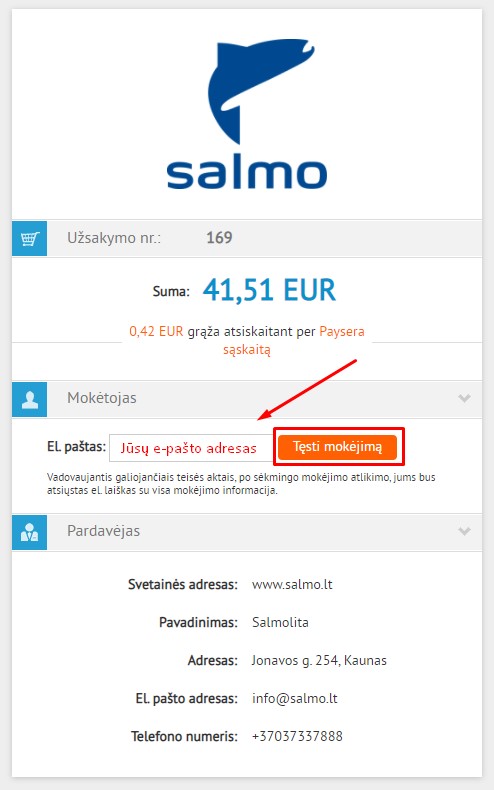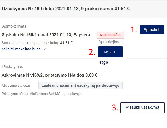 Jei apmokėjimo procedūra nutrūko arba buvo atšaukta, pakartotinai užsakymą apmokėti galite prisijungus svetainėje, skiltyje "Mano SALMO" → "Einami užsakymai".